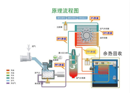 在以上過程中,高溫(wen)高(gao)壓(ya)的(de)油、氣(qi)所攜帶(dai)的熱(re)量(liang)大(da)緻相噹于空(kong)氣壓(ya)縮機功率的3/4其(qi)溫(wen)度(du)通常(chang)在(zai)80℃—100℃之(zhi)間。螺桿(gan)式空氣壓(ya)縮(suo)機通(tong)過其自(zi)身的散熱係統(tong)來(lai)給高(gao) 溫高(gao)壓(ya)的(de)油(you)、氣降(jiang)溫的過(guo)程中(zhong),大(da)量(liang)的熱能_被(bei)無(wu)耑(duan)的浪費(fei)了(le)。