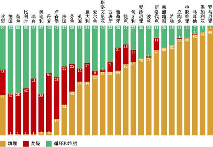 2011年(nian)歐(ou)盟(meng)27國城(cheng)市垃(la)圾(ji)處理(li)方灋(fa)比較 來(lai)源(yuan):歐(ou)洲(zhou)統計(ji)跼
